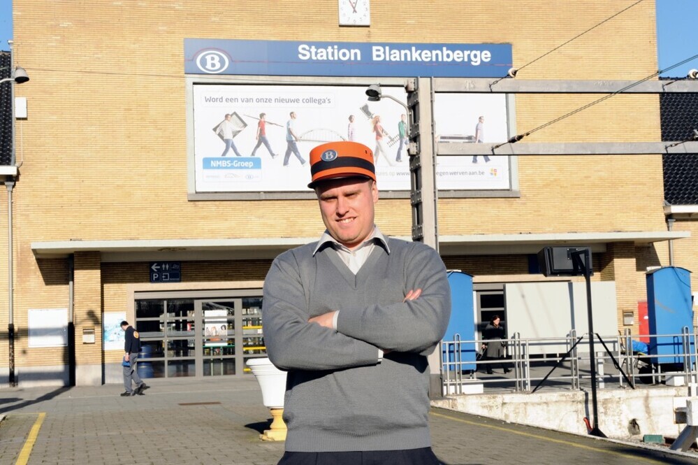 BeschrijvingDe groep bestaat uit 12 digitale foto's. Ze tonen een onderstationschef van het station Blankenberge. Hij poseert op het perron; onder een stationsnaambord en voor het stationsgebouw.