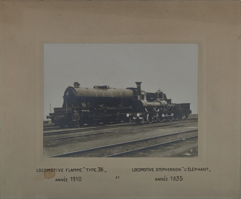 Op de foto staan twee locomotieven naast elkaar. Vooraan staat een replica op ware grootte van stoomlocomotief 'L'Eléphant' (1B), een van de eerste drie stoomlocomotieven in België (1835). Daarnaast staat locomotief 4454 van het type 36 (1E Decapod). Deze locomotief dateert uit 1910. De opstelling toont hoeveel groter, zwaarder en daardoor krachtiger de locomotieven op 80 jaar geworden zijn. Naast elke locomotief poseert een machinist.