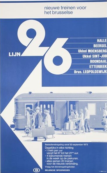 Deze blauwe affiche maakt reclame voor de nieuwe dienstregeling van 1973 op lijn 26 (Schaarbeek-Halle) en lijn 26/4 (verbindingslijn tussen Boondaal en Etterbeek om daar over te gaan in lijn 161). Het nummer 26 staat in grote witte letters bovenaan, met daarnaast een opsomming van de verschillende stations langs de lijn. Centraal is een witte pijl afgebeeld met daarin een blauw gearceerde foto van reizigers op het perron. Onderaan wordt de nieuwe dienstregeling vermeld.