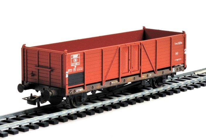 Bruine stortwagen van het type E.3. De wagen heeft aan beide zijkanten een deurtje om de goederen makkelijker uit te storten. Er staan verschillende opschriften op de zijkanten, zoals het wagennummer, 'Type 1221B' en het logo van de NMBS. De maquette werd op schaal H0 1/87 vervaardigd.