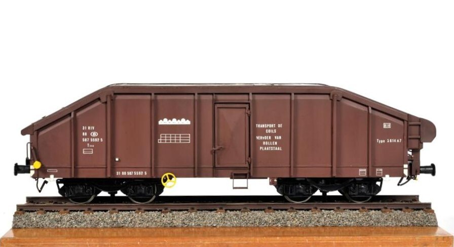 Schaalmodel van een bruine wagen met zilverkleurig oprolbaar dak. Aan beide zijkanten bevindt zich een deur. Op de wagen staan verschillende opschriften, waaronder het NMBS-logo, het identificatienummer en 'Transport de coils vervoer van rollen plaatstaal'. Het schaalmodel is vervaardigd op schaal 1/20 en werd gemonteerd op een houten plaat.