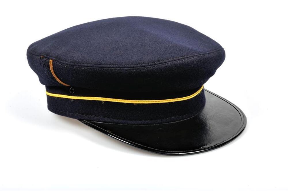 Donkerblauwe dienstpet met een zwarte klep in kunststof. Er loopt een gele bies op 2,5 centimeter boven de rand. Aan beide zijden loopt een enkele bruine verticale streep. De pet is versterkt met een leren band en de voering is lichtbruin. Het spoorweginsigne ontbreekt.