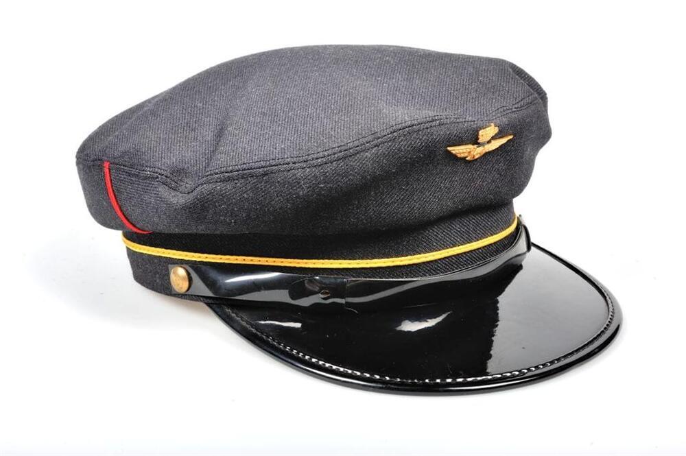 Grijze dienstpet met een zwarte klep in kunststof. De stormband is van kunststof en vastgemaakt met ronde metalen knopen. Er loopt een gele bies op 2 cm boven de rand en een enkele rode verticale streep aan beide zijkanten. Vooraan is een spoorweginsigne bevestigd. De pet is verstevigd met een leren band en de voering is beige.