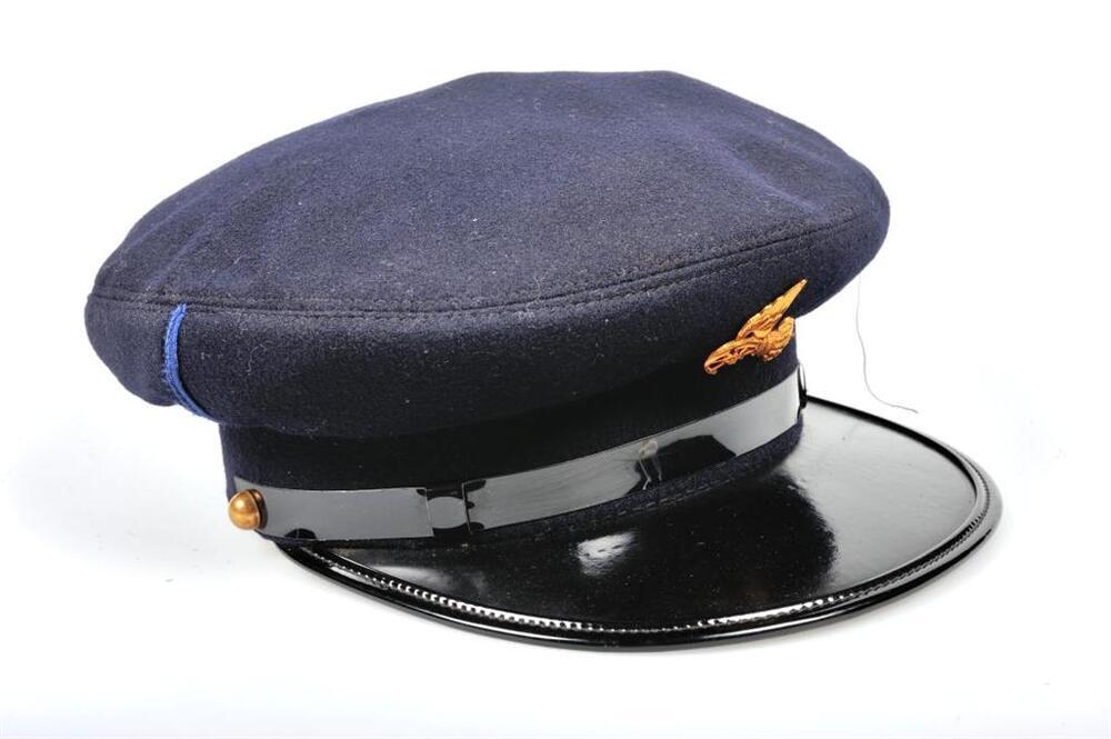 BeschrijvingZwarte dienstpet met een zwarte klep in kunststof. De zwarte stormband is van kunststof en vastgemaakt met ronde knopen. Aan beide zijkanten loopt een enkele blauwe verticale streep. Vooraan is een spoorweginsigne bevestigd. De pet is verstevigd met een leren band en de voering is grijs.