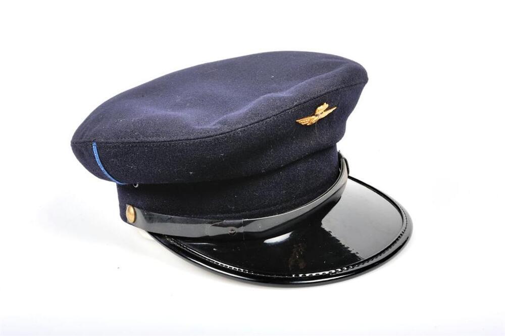 Zwarte dienstpet met een zwarte klep in kunststof. De zwarte stormband is van kunststof en vastgemaakt met ronde knopen. Aan beide zijkanten loopt een enkele blauwe verticale streep. Vooraan is een spoorweginsigne bevestigd. De pet is verstevigd met een leren band.