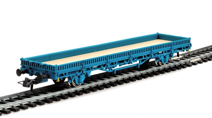 BeschrijvingSchaalmodel van een blauwe platte wagen op twee assen. Op de zijkanten staan enkele opschriften. De maquette werd op schaal H0 1/87 vervaardigd.
