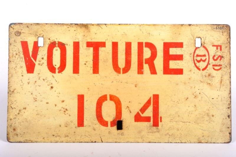 Wit bord met rode letters en cijfers. In de rechterbovenhoek staan het logo van de NMBS en het opschrift 'FSD' (Oostende). Dit bord hing aan de buitenkant van een rijtuig van een internationale trein, zodat de reizigers hun gereserveerde zitplaatsen gemakkelijk konden opzoeken.