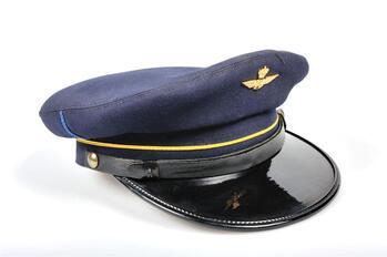 BeschrijvingDonkerblauwe dienstpet met een zwarte klep in kunststof. De leren stormband is vastgemaakt met twee metalen knopen. Er loopt een gele bies op 2 cm boven de rand. Aan beide zijkanten loopt een enkele blauwe verticale streep. Vooraan is een spoorweginsigne bevestigd. De pet is verstevigd met een leren band en de voering is zwart.