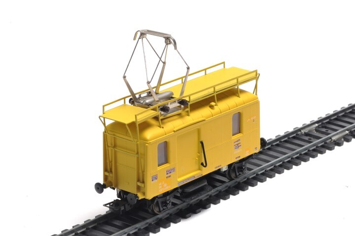 Deze gele wagen van het type U Abay heeft een platform en een pantograaf. Op de zijkanten bevinden zich verschillende opschriften, zoals het wagennummer, 'Type 9572B1' en 'Werktrein E.T.S. Dadelijk terug naar Enghien'. Deze maquette is op schaal H0 1/87 vervaardigd.