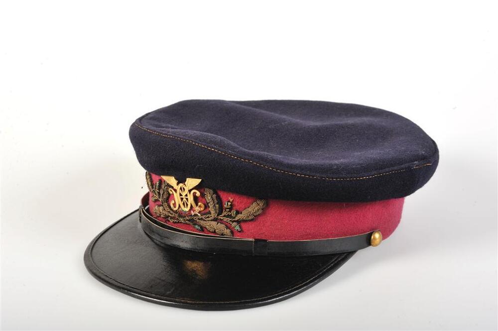 De 'Compagnie de Chimay' exploiteerde de lijn Chimay - Mariembourg - Hastière (tot haar overname door de NMBS in 1948). Deze blauwe dienstpet heeft een scharlaken band en een zwarte klep in kunststof. Boven de klep is een leren stormband bevestigd met twee ronde metalen knopen. Vooraan is een spoorweginsigne bevestigd met een gevleugeld wiel en het monogram 'CC'. Daarrond is een floraal patroon met gouddraad aangebracht. De pet is verstevigd met een bruine leren band en de voering is grijsbruin.