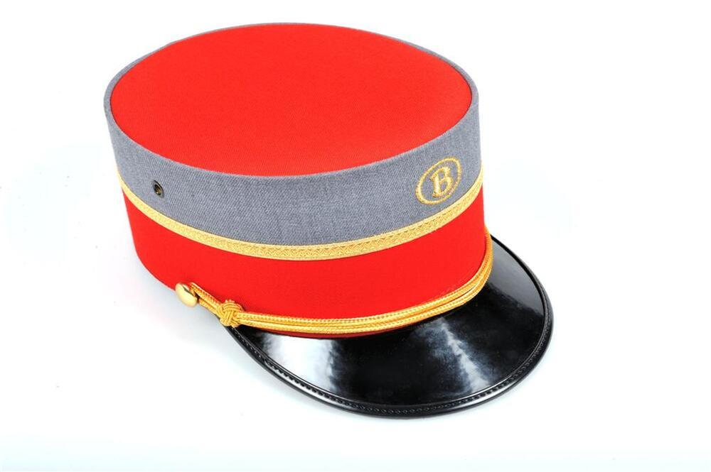 Kepie in lichtgrijs en rood met een zwarte klep in kunststof. Er loopt een gouden bies op 4,5 cm boven de rand. Boven de klep is een dubbele gouden koord bevestigd met twee ronde goudkleurige knopen. Vooraan is het logo van de NMBS geborduurd in gouddraad. De kepie is verstevigd met een leren band en de voering is zwart.