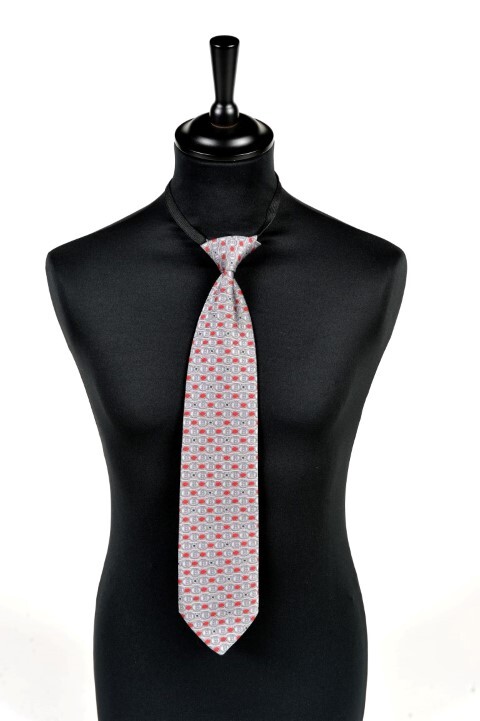 BeschrijvingLichtgrijze das met rode ovalen en grijze logo's van de NMBS. De das wordt met een zwarte rekker rond de hals gesloten.