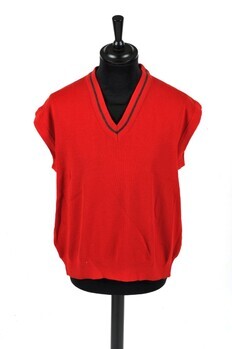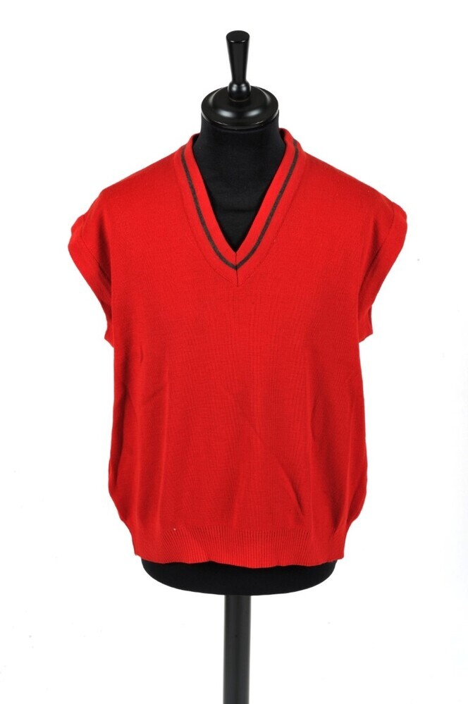 BeschrijvingDeze rode mouwloze trui heeft een V-hals met zwart boordje.