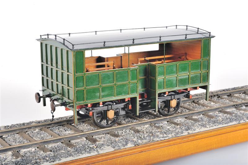 Dit schaalmodel stelt een rijtuig tweede klas van de Belgische Staatsspoorwegen uit de periode 1835-1850 voor. Dit houten rijtuig was wel overdekt maar bevatte geen ramen. Zeildoeken zorgden voor een beperkte beschutting van de reizigers. De maquette is gemaakt op schaal 1/10.
