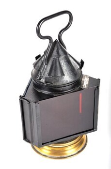 BeschrijvingIn geval van nood of bij een defect sein kon men met een handsein een waarschuwing geven aan de treinbestuurders. 's Nachts deed men dit door de trein tegemoet te lopen, zwaaiend met een seinlantaarn. Deze zwarte lantaarn heeft twee glazen zijden in de kleuren blauw en rood (om de trein onmiddellijk te laten stoppen). Het derde glasplaatje ontbreekt. De lantaarn staat op een goudkleurige ronde voet en heeft bovenaan een handvat.