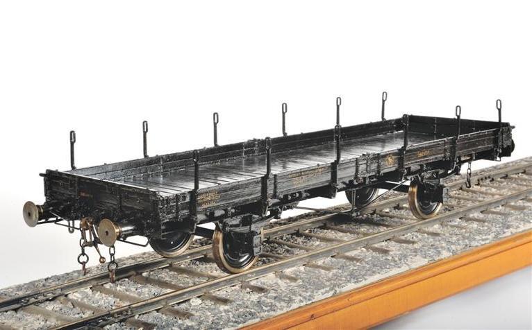 Deze zwarte platte wagen van 15 ton werd gebouwd in 1893 voor de Belgische Staatsspoorwegen. De wagen heeft beweegbare schotten en rongen; dit zijn verticale balken aan de zijkanten die dienen voor de bevestiging en opsluiting van de lading. De rongen kunnen afgenomen of weggeklapt worden bij het laden en lossen. De maquette is gemaakt op schaal 1/10.