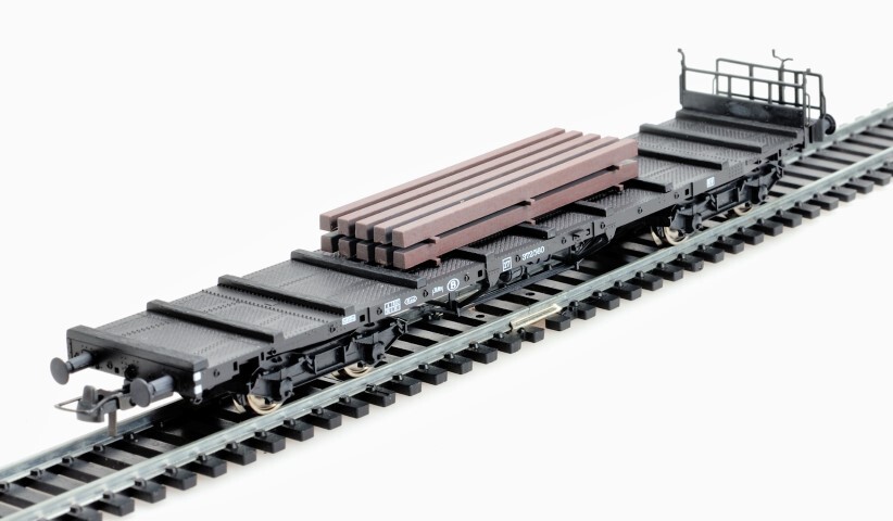 Deze zwarte platte wagen van het type Rs heeft als lading enkele bruine balken, die zich los op de wagen bevinden. Op de zijkanten van de wagen staan verschillende opschriften, waaronder het logo van de NMBS en het wagennummer. De maquette is gemaakt op schaal H0 1/87.