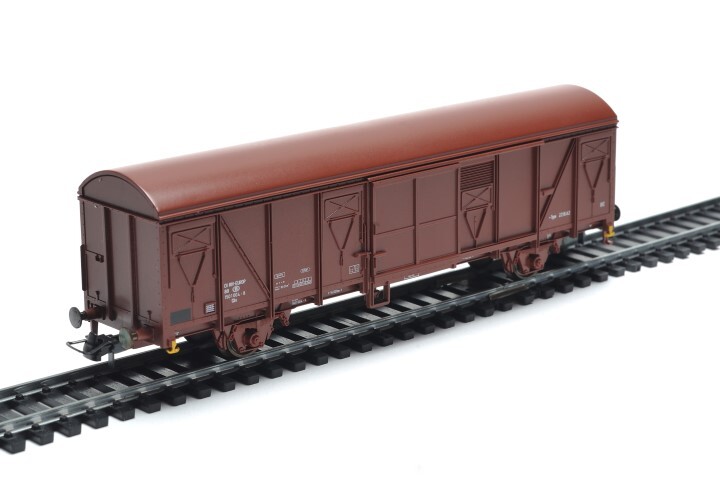 Bruine gesloten wagen met bolvormig dak op twee assen van het type Gbs. Op de zijkanten is er een schuifdeur aanwezig en staan verschillende opschriften, zoals het wagennummer en het logo van de NMBS. De maquette is op schaal H0 1/87 vervaardigd.