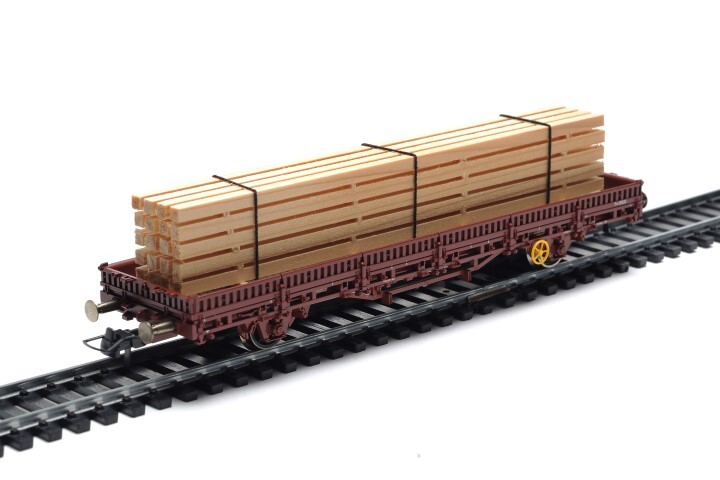 Deze bruine platte wagen op draaistellen van het type Rs, heeft als lading samengebonden houten balken die zich los op de wagen bevinden. Op de zijkanten van de wagen staan twee gele draaiwielen en verschillende opschriften, waaronder het type van de wagen. De maquette is gemaakt op schaal H0 1/87.