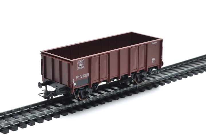 Bruine stortwagen van het type E. Deze wagen heeft aan beide zijkanten twee deurtjes om de goederen makkelijker uit te storten. Er staan verschillende opschriften op de zijkanten, zoals het wagennummer, 'Type 1215A' en het logo van de NMBS. De maquette werd op schaal H0 1/87 vervaardigd.