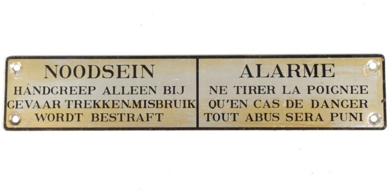 Metalen bordje met zwarte letters. Werd in een rijtuig opgehangen om het noodsein aan te duiden en om de reizigers te wijzen op het feit dat het onrechtmatig gebruiken van een noodsein bestraft zal worden.