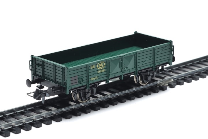 Groene stortwagen van het type E. Op de zijkanten staan verschillende opschriften, zoals het identificatienummer en het logo van de NMBS. De wagen heeft aan beide zijkanten een deur om de goederen makkelijker uit te storten. De maquette is op schaal H0 1/87 vervaardigd.