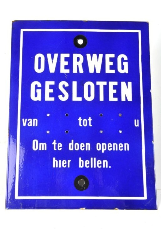 BeschrijvingBlauw bord met witte letters en de mogelijkheid om cijferbordjes aan te hangen die de sluitingsuren weergeven.