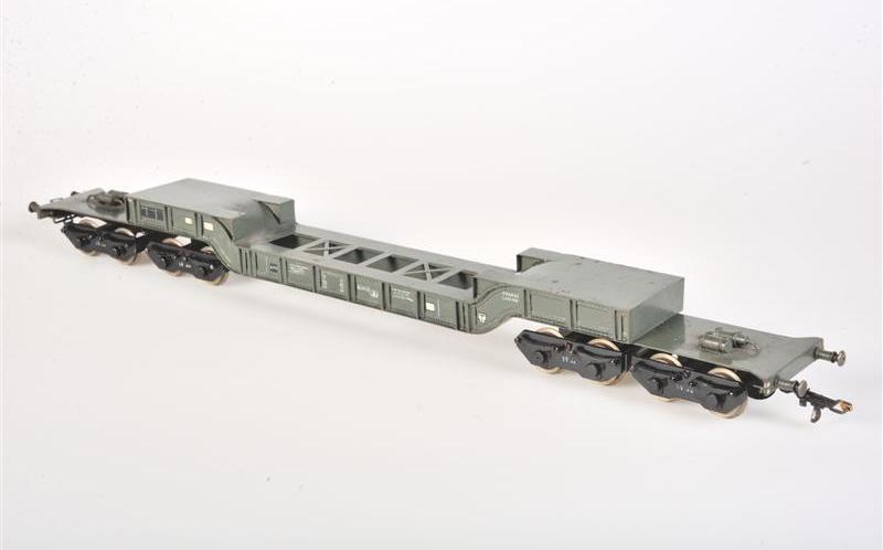 Schaalmodel van een platte wagen uit 1930. De wagen was 22,86 m lang, had een verlaagde vloer en kon tot 100 ton vervoeren. Er staan verschillende opschriften op de zijkanten van deze grijze wagen, zoals het wagennummer, het logo van de NMBS en 'charge lading'. De maquette is op schaal 1/43 vervaardigd.
