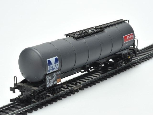 Deze donkergrijze ketelwagen van het type Zas diende voor het vervoer van petroleumproducten. Op de zijkanten staan verschillende opschriften, zoals 'Millet S.A.', 'Esso', het wagennummer en de stelplaats. De maquette is op schaal H0 1/87 vervaardigd.