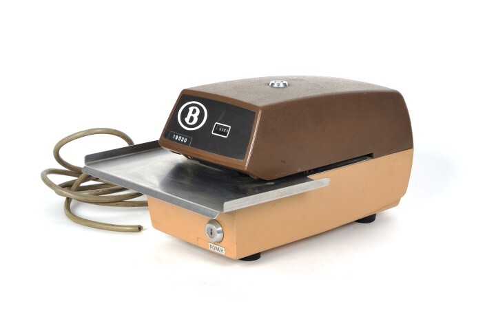 Deze prikklok controleert de arbeidsduur van de werknemers door het dagelijks registreren van aankomst- en vertrektijden. De machine is opgedeeld in twee blokken met ertussen een metalen plaat. Vooraan heeft men een schermpje voorzien waarop een tijdscode kan worden afgelezen. Nu staat er het getal '31621' te lezen. Aan de voorkant bevinden zich ook nog het logo van de NMBS en een slot om de machine aan te zetten. Onder het slot staat 'Power'.
