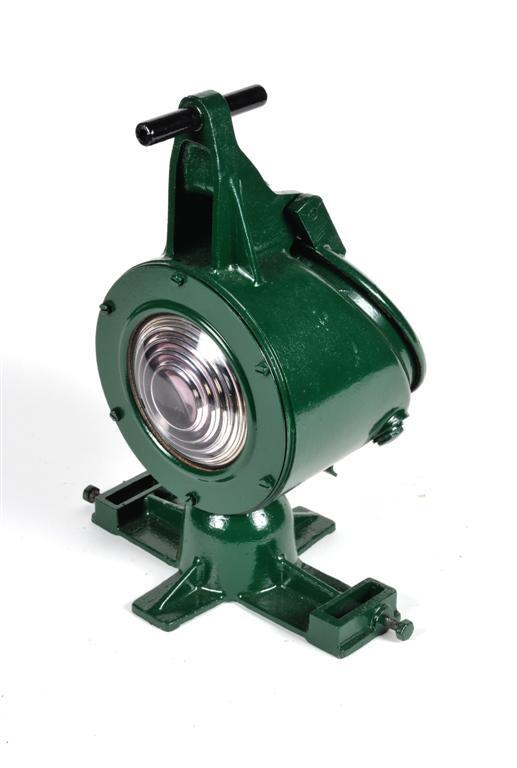 Deze groene elektrische lamp werd aan een seinpaal bevestigd voor het geven van nachtseinen. Met het buisje bovenaan kon de lamp goed gericht worden. De achterkant kon opengeklapt worden om de lamp te vervangen. Op de achterkant is het NMBS-logo aangebracht.