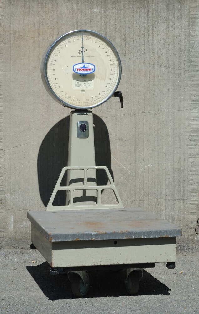 Grijze weegschaal met een voetplaat en een ronde wijzerplaat, die langs beide zijden het gewicht laat zien. Deze witte wijzerplaat heeft een blauwe wijzer en is in twee delen verdeeld. De beide helften gaan van 0 tot 10 met tussen elk cijfer aanduidingen van het aantal gram (400, 500 en 600). Opmerkelijk is dat één helft van 1 naar 10 gaat en de andere helft het tegenovergestelde aanduidt.