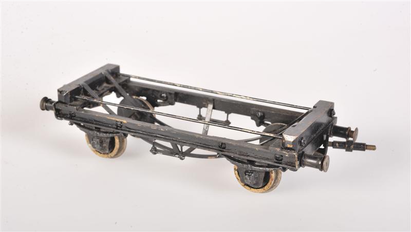 BeschrijvingSchaalmodel van een zwarte platte wagen met een verlaagde vloer. De maquette is gemaakt op schaal 1/43.