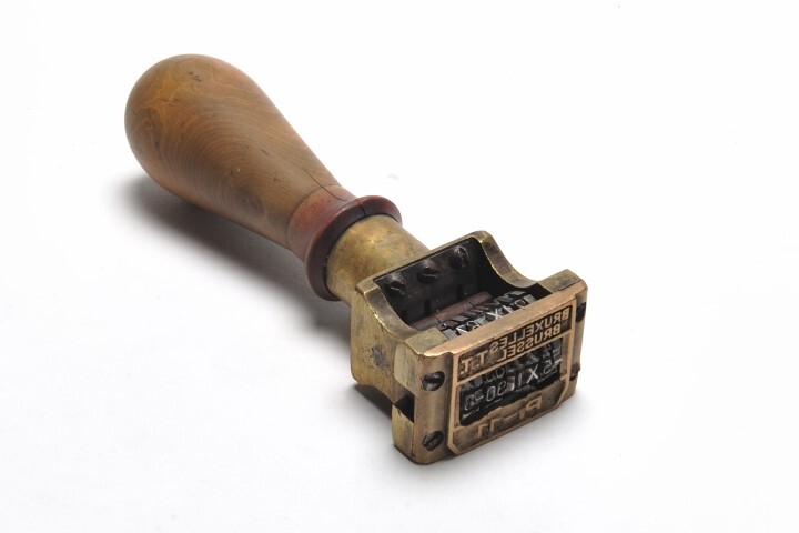 TitelMetalen stempel 'Bruxelles Brussel T.T. P.-11' met houten handvat en een verrolbare datum