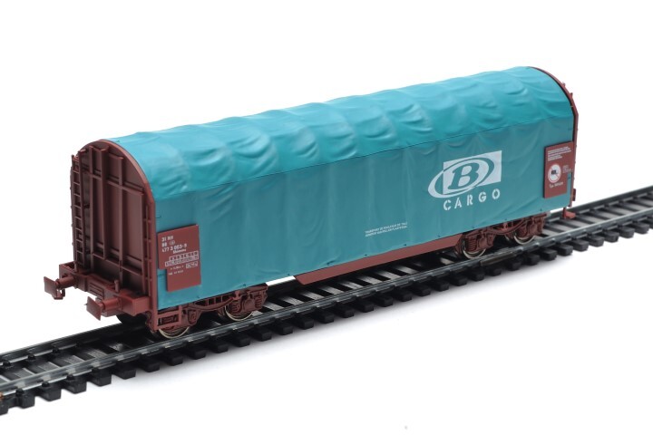 Bruine platte wagen op draaistellen met groenblauwe huif. Deze wagen van het type Shimms is bedoeld voor het vervoer van rollen plaatstaal. Het heeft verschillende opschriften op de zijkanten, waaronder 'B Cargo' en het wagennummer. De maquette is gemaakt op schaal H0 1/87.