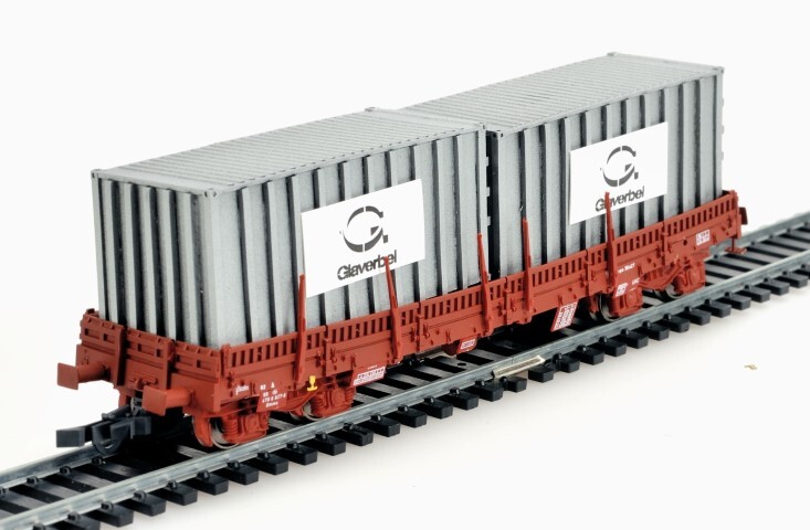 Schaalmodel van een bruine platte wagen met lettercode Smms. De wagen heeft rongen, dit zijn verticale balken aan de zijkanten die dienen voor de bevestiging en opsluiting van de lading. De rongen kunnen afgenomen of weggeklapt worden bij het laden en lossen. Op de zijkanten van de wagen staan verschillende opschriften, zoals het wagennummer 82 88 470 6 027-8 en het logo van de NMBS. Op de wagen staan twee grijze containers van Glaverbel. De maquette is op schaal H0 1/87 vervaardigd.