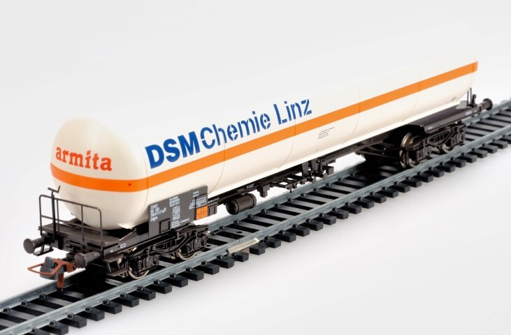 BeschrijvingDeze witte ketelwagen van het type Zagns heeft een oranje band en verschillende opschriften op de zijkanten, waaronder 'DSM Chemie Linz' en het wagennummer. Op de voorzijde staat 'Armita'. De maquette werd op schaal H0 1/87 vervaardigd.