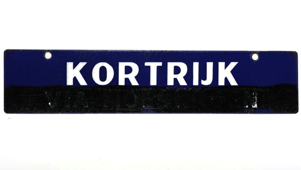 BeschrijvingBlauw bord met witte letters. Werd aan een treinaankondiger gehangen om treinen richting Kortrijk via Moeskroen aan te kondigen. Het opschrift 'via Moeskroen' werd later met zwarte verf overschilderd