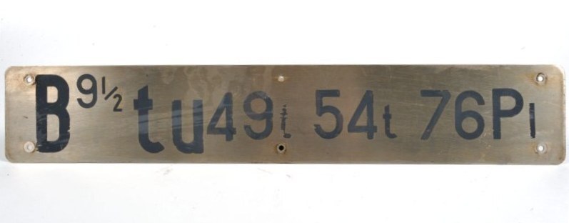 Cette plaque d’immatriculation provient d’une des quatre voitures TEE en inox de première classe, convertie en deuxième classe par la SNCB en 1984. Cela s’est produit à l’occasion de la modification des TEE en EuroCity. Ces voitures ont reçu une bande verte à la place d’une rouge au-dessus des fenêtres. « B9 1/2 » signifie que c’est une voiture de deuxième classe avec neuf compartiments et un compartiment de service. « 49 t » désigne le poids net de la voiture et « 54 t » le poids brut. « 76 Pl » veut dire qu’il y avait 76 places assises dans la voiture.