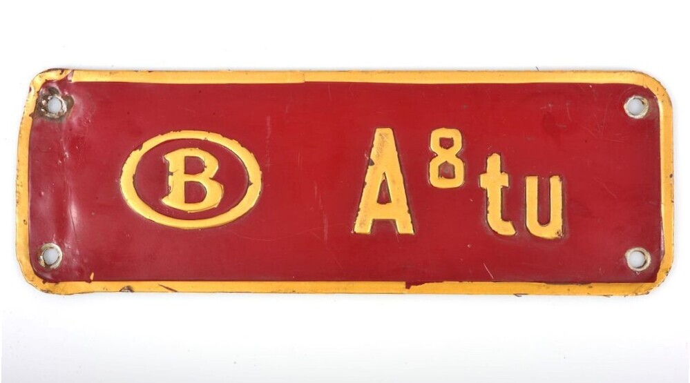 DescriptionCe panneau était accroché aux voitures des TEE et indiquait qu’il s’agissait d’une voiture de première classe (A) avec huit compartiments (8), un couloir central (t) et air conditionné (u). Ce panneau est bordeaux avec un contour doré. Les inscriptions et le logo sont dorés et en relief.