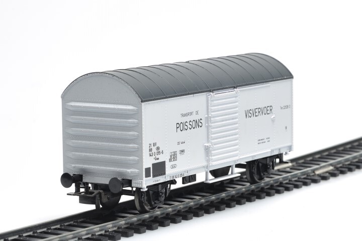 Een koelwagen is een geïsoleerde wagen met eventueel een koelingssysteem om (etens)waren die snel bederven te vervoeren. Deze witte gesloten wagen diende voor het vervoer van vis. De wagen heeft lettercode Gkklms, typenummer 2212B O en identificatienummer 21 88 143 0 015-6. Op de zijkanten van het schaalmodel staan verschillende opschriften, zoals het NMBS- logo en 'retour immediat a dadelijk terug naar Oostende vismijn'. De maquette is op schaal H0 1/87 vervaardigd.