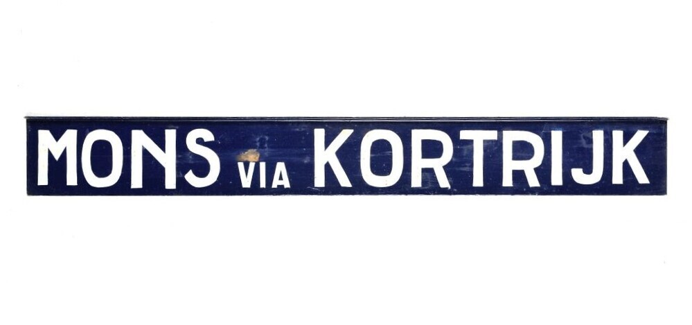 BeschrijvingBlauw bord met witte letters. Werd aan een treinaankondiger gehangen om treinen richting Bergen via Kortrijk aan te kondigen.