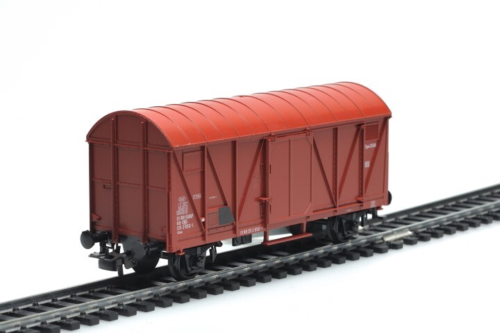 Schaalmodel van een bruine gesloten wagen op twee assen en met schuifdeuren. De wagen heeft lettercode Gkklms (uit 1947), typenummer 2211AO en identificatienummer 01 88 135 3 950-1. Op de zijkanten staan verschillende opschriften zoals het logo van de NMBS. De maquette is op schaal H0 1/87 vervaardigd. Schenking Léon Guilmot.