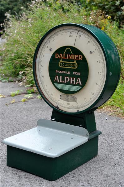 Groene weegschaal Alpha nr. 3613 met een wijzerplaat die tot 20 kilogram gaat. Deze weegschaal werd gebruikt voor het wegen van pakjes. Ze heeft langs twee kanten een wijzerplaat, beschermd door een doorzichtige kunststoffen plaat.