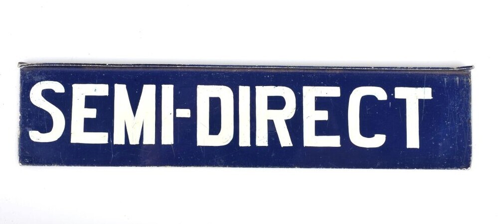 BeschrijvingBlauw bord met witte letters. Werd aan een treinaankondiger gehangen om semi-directe treinen aan te kondigen.