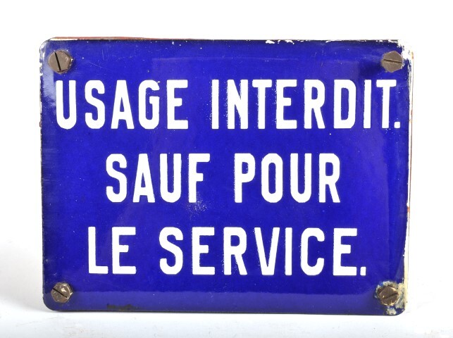 Blauw bord met witte letters. In de vier hoeken houden vier vijzen de twee platen waaruit het bord bestaat, vast. De achterkant van het bord is rood. Dit bord duidde het verbod aan voor onbevoegden om de goederenlift van het station Brussel-Leopoldswijk (het huidige Brussel-Luxemburg) te betreden.