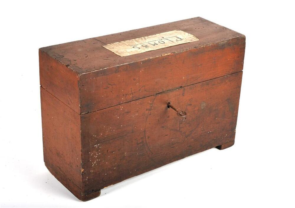 Bruine houten kist waarop 'plombs' staat. Binnenin is de kist onderverdeeld in twee compartimenten: één compartiment voor de reservevoorraad en een tweede compartiment voor de afgesneden loodjes. Vermoedelijk werden deze loodjes gebruikt om ondermeer de noodrem te verzegelen. In het linkse compartiment zit ijzerdraad, in het rechtse zitten sleutels en loodjes.
