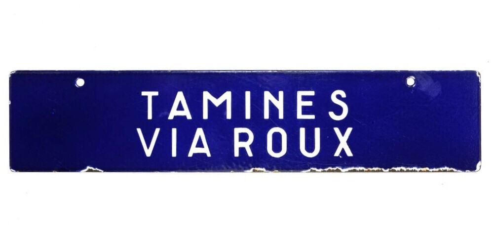 BeschrijvingBlauw bord met witte letters. Werd aan een treinaankondiger gehangen om treinen richting Tamines via Roux aan te kondigen.