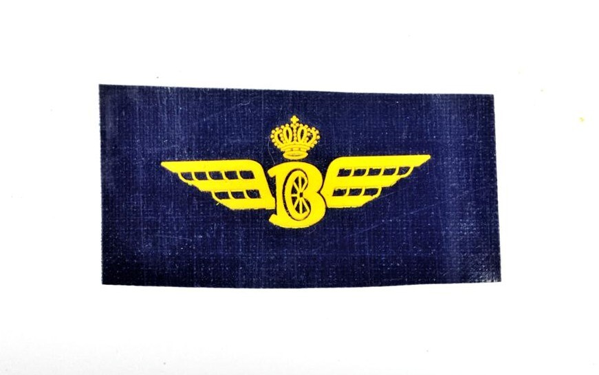 TitelBlauw insigne met geel gevleugeld en gekroond wiel, vervlochten met de typische B van de NMBS