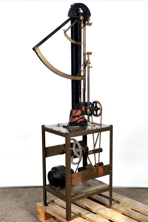 Deze machine is ingewerkt in een metalen tafeltje en heeft verschillende spoelen, meters en hendels om de trekweerstand te bepalen van koorden en lichte kabels.